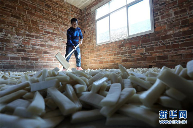 11月4日,在貴州省黎平縣中潮鎮(zhèn)佳所侗寨,村民在晾曬“侗果”粑塊。 近日,貴州省黔東南苗族侗族自治州黎平縣中潮鎮(zhèn)佳所侗寨的村民們搶抓晴好天氣,忙著制作、晾曬“侗果”,侗寨里一派忙碌。“侗果”是當(dāng)?shù)囟弊逋捅貍涞奶厣朗常菍⒄羰斓呐疵浊谐尚◆螇K后,再經(jīng)曬干、油炸、澆紅糖和上芝麻等工序制作而成。 新華社發(fā)(楊代富 攝)