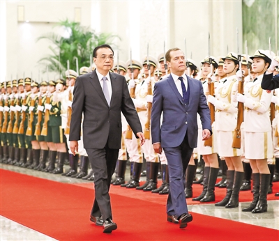 李克強表示,中俄互為最大鄰國,互為重要發(fā)展機遇。習近平主席和普京總統(tǒng)多次成功會晤,兩國全面戰(zhàn)略協(xié)作伙伴關系始終保持高水平運行,這既符合兩國和兩國人民的利益,也有利于為世界注入更多穩(wěn)定力量,促進世界經(jīng)濟復蘇進程。本次總理會晤是兩國各自完成政府換屆以來的首次會晤,具有承上啟下重要意義。會晤框架下各委員會機制積極開展工作,相關領域合作取得重要新成果。中方愿同俄方持續(xù)深化政治和戰(zhàn)略互信,擴大全方位合作,共同為維護世界和平、穩(wěn)定與發(fā)展作出貢獻。