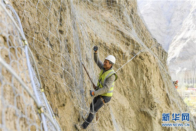 11月12日,在新疆塔什庫爾干塔吉克自治縣大同鄉(xiāng)阿依克日克村的一處路段,工人在峭壁上安裝防護網(wǎng)。 近日,一支由四川、云南等地工人組成的施工隊忙碌在帕米爾高原深處的大山中,為塔什庫爾干塔吉克自治縣縣城至大同鄉(xiāng)道路的易落石路段安裝防護網(wǎng)。崇山峻嶺間,工人要攀爬至峭壁上施工作業(yè),如躍動在大山間的“舞者”。據(jù)介紹,這支施工隊常年活躍在新疆山區(qū)道路的施工現(xiàn)場,為風(fēng)險路段加裝安全防護裝置,保障過往車輛和沿途村民出行安全。 新華社記者 胡虎虎 攝