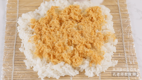 4.竹簾上鋪一層保鮮膜,將蒸好的米飯趁熱盛出鋪在竹簾上,竹簾邊緣留出2cm左右的空隙。(米飯趁熱時操作才不會粘手,如果有點粘手的話,可以將雙手粘少許涼白開水操作。)