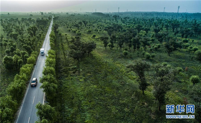 汽車(chē)行駛在陜西省榆林市靖邊縣東坑鎮(zhèn)新建村的道路上(2018年8月1日無(wú)人機(jī)拍攝)。陜西省開(kāi)展的天然林保護(hù)工程和全面治理荒沙行動(dòng),極大改善了毛烏素的生態(tài)環(huán)境,也使沙漠南緣的陜西省榆林市實(shí)現(xiàn)從“沙進(jìn)人退”到“綠進(jìn)沙退”的轉(zhuǎn)變。 新華社記者 陶明 攝