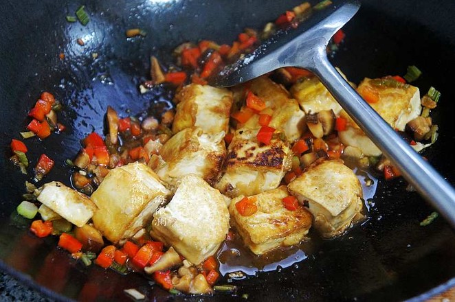 主料:豆腐10小塊 紅椒半個 青椒半個 香菇2朵