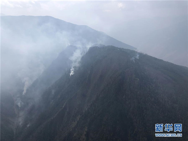 俯瞰四川省涼山州木里縣雅礱江鎮(zhèn)火場(chǎng)火點(diǎn)(4月1日攝)。新華社發(fā)(林繼平 攝)