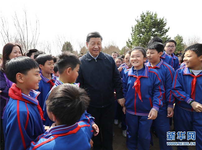 4月8日,黨和國家領(lǐng)導(dǎo)人習(xí)近平、栗戰(zhàn)書、汪洋、王滬寧、趙樂際、韓正、王岐山等來到北京市通州區(qū)永順鎮(zhèn)參加首都義務(wù)植樹活動。這是習(xí)近平同少先隊(duì)員在一起。 新華社記者 鞠鵬 攝