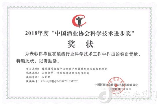近日,中國(guó)酒業(yè)協(xié)會(huì)第五屆理事會(huì)擴(kuò)大會(huì)議在北京隆重舉行,大會(huì)突出表彰了在釀酒產(chǎn)業(yè)科技發(fā)明、技術(shù)推廣、科技成果轉(zhuǎn)化等方面取得了杰出業(yè)績(jī)和重要貢獻(xiàn)的領(lǐng)軍人才和優(yōu)秀專(zhuān)家,表彰了2018年度“中國(guó)酒業(yè)協(xié)會(huì)科學(xué)技術(shù)獎(jiǎng)”獲獎(jiǎng)項(xiàng)目和論文的完成單位及個(gè)人,并頒發(fā)證書(shū)及獎(jiǎng)金。西鳳集團(tuán)公司《西鳳酒用大曲中土味素產(chǎn)生菌的發(fā)現(xiàn)及其控制研究》項(xiàng)目榮獲中國(guó)酒業(yè)協(xié)會(huì)科學(xué)技術(shù)進(jìn)步獎(jiǎng)三等獎(jiǎng)。受到了大會(huì)表彰。