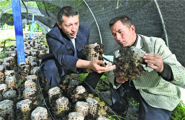 4月30日,新疆烏什縣委組織部駐阿克托海鄉(xiāng)庫木奇吾斯塘村“訪惠聚”工作隊隊員艾克熱木·艾麥提(左)在工作隊建立的黑木耳種植示范基地,為該村貧困戶講解黑木耳種植技術(shù)。約提克爾·尼加提 攝