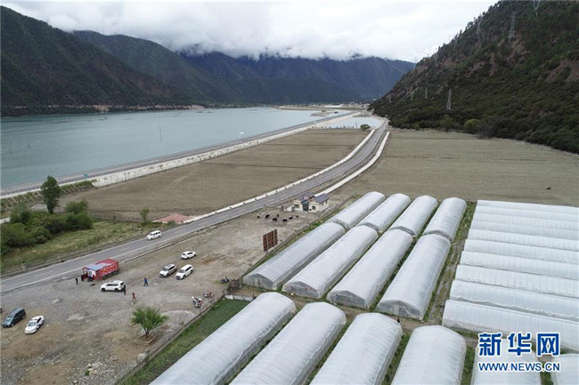 這是位于川藏公路旁的久巴村草莓種植大棚(5月14日,無人機拍攝)。新華社記者 李鑫 攝