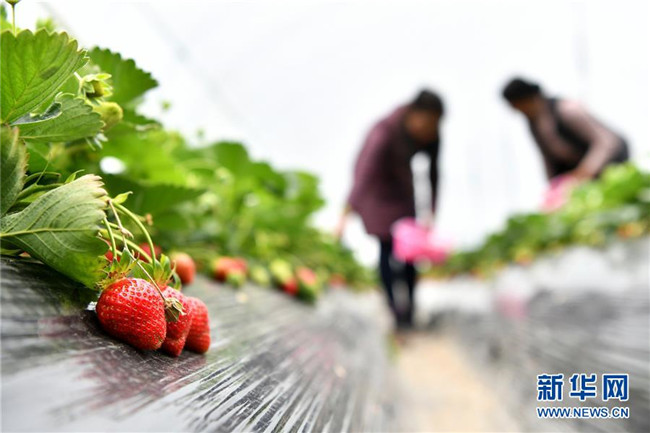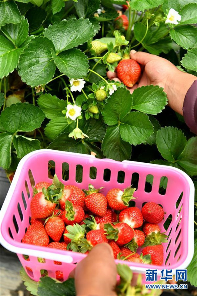 5月14日,久巴村村民在大棚里采摘草莓。 新華社記者 李鑫 攝