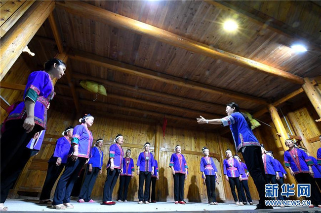 5月27日晚,在廣西柳州市三江侗族自治縣良口鄉(xiāng)燕茶村,吳純娟與村民在戲臺上排練侗族大歌。 今年42歲的吳純娟是廣西柳州市三江侗族自治縣文化館的一名文藝輔導(dǎo)員。她從小喜歡唱歌,工作后接觸并喜歡上侗族大歌,2005年起專門拜師學(xué)唱侗族大歌。如今,侗族大歌成為她主要輔導(dǎo)和傳承的音樂之一。今年3月中旬,她成為三江縣良口鄉(xiāng)燕茶村一名駐村工作隊員,侗族大歌是她扶貧的法寶。 燕茶村位于侗鄉(xiāng)大山深處的山腰上,村民們雖然熱愛歌舞,但卻無人會唱侗族大歌。吳純娟進(jìn)村后,當(dāng)即在村里開設(shè)了侗族大歌免費培訓(xùn)班,利用晚上及其他工作之余的時間教村民唱侗族大歌,受到村民歡迎。如今,燕茶村專門成立“侗族大歌文藝隊”,隊員從一開始的20人迅速發(fā)展到33人。村部會議室、村里的戲臺、還有山上的千畝茶園……他們的歌聲幾乎傳遍了燕茶村的每個角落。 “這段時間,吳老師還利用休息時間教學(xué)校老師和學(xué)生唱侗族大歌。”燕茶村燕子小學(xué)老師楊雪連說,學(xué)校里從來沒有音樂老師,吳老師在學(xué)校里開班,師生們學(xué)習(xí)熱情也非常高。 吳純娟說:“每首侗族大歌歌唱的都是自然、勞動和愛情之美,傳承民族文化的同時,我更希望激發(fā)貧困山區(qū)群眾對美好生活的向往,提高自信,共同脫貧致富。”據(jù)了解,侗族大歌是侗族地區(qū)一種多聲部、無指揮、無伴奏、自然和聲的原生態(tài)音樂。2005年,侗族大歌被列入我國第一批非物質(zhì)文化遺產(chǎn)名錄,2009年被列入世界人類非物質(zhì)文化遺產(chǎn)代表作名錄。
