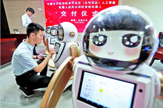 6月10日,在烏魯木齊經濟技術開發(fā)區(qū)(頭屯河區(qū))維泰大廈,新疆創(chuàng)澤機器人科技有限公司工程師在調試機器人“創(chuàng)創(chuàng)”。 當日,該公司生產的75臺人工智能機器人正式交付經開區(qū)(頭屯河區(qū))政務服務、社區(qū)、學校等場所,這也標志著烏魯木齊經開區(qū)(頭屯河區(qū))國家級人工智能機器人應用示范區(qū)正式啟動。(謝龍)