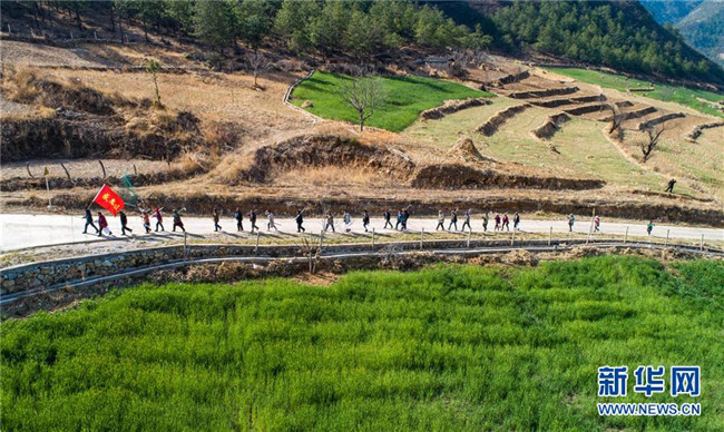 “精準(zhǔn)扶貧感恩連”在云南香格里拉市五境鄉(xiāng)開展植樹活動(3月13日無人機(jī)拍攝)。新華社記者 胡超 攝