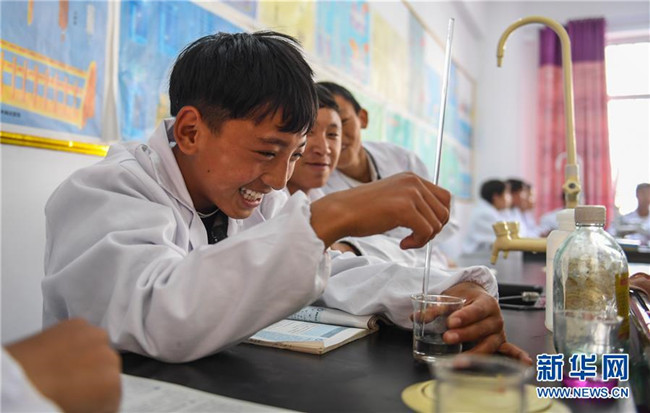 鹽井中學(xué)的學(xué)生們?cè)谏匣瘜W(xué)課(6月6日攝)。年輕的藏族女教師坐在鋼琴前,手指靈動(dòng)地彈奏樂曲,兩名學(xué)生拉起弦子伴奏,三十多名學(xué)生站成四排,齊聲合唱。學(xué)?;@球場(chǎng)上數(shù)名身材高大的學(xué)生,正在體育老師的組織下進(jìn)行激烈的分組對(duì)抗,不一會(huì)兒,學(xué)生們個(gè)個(gè)汗流浹背。綜合樓三樓的化學(xué)實(shí)驗(yàn)室內(nèi),身穿白色大褂的學(xué)生,分成若干小組,正在做簡單的化學(xué)實(shí)驗(yàn)。這一幕幕,同時(shí)出現(xiàn)在西藏昌都市芒康縣鹽井中學(xué)。新華社記者晉美多吉攝