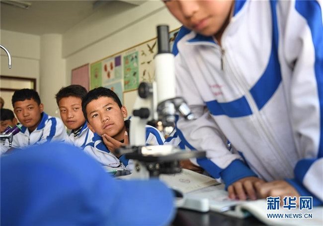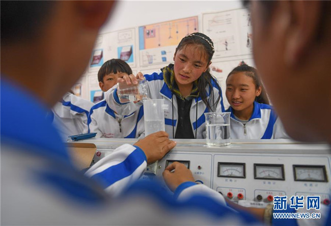 鹽井中學(xué)的學(xué)生們?cè)谏衔锢碚n(6月6日攝)。年輕的藏族女教師坐在鋼琴前,手指靈動(dòng)地彈奏樂曲,兩名學(xué)生拉起弦子伴奏,三十多名學(xué)生站成四排,齊聲合唱。學(xué)?;@球場(chǎng)上數(shù)名身材高大的學(xué)生,正在體育老師的組織下進(jìn)行激烈的分組對(duì)抗,不一會(huì)兒,學(xué)生們個(gè)個(gè)汗流浹背。綜合樓三樓的化學(xué)實(shí)驗(yàn)室內(nèi),身穿白色大褂的學(xué)生,分成若干小組,正在做簡單的化學(xué)實(shí)驗(yàn)。這一幕幕,同時(shí)出現(xiàn)在西藏昌都市芒康縣鹽井中學(xué)。新華社記者晉美多吉攝