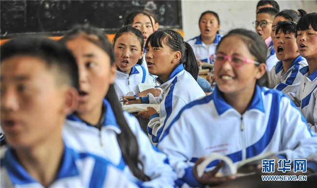 鹽井中學(xué)的學(xué)生們?cè)谏嫌⒄Z課(6月6日攝)。年輕的藏族女教師坐在鋼琴前,手指靈動(dòng)地彈奏樂曲,兩名學(xué)生拉起弦子伴奏,三十多名學(xué)生站成四排,齊聲合唱。學(xué)?;@球場(chǎng)上數(shù)名身材高大的學(xué)生,正在體育老師的組織下進(jìn)行激烈的分組對(duì)抗,不一會(huì)兒,學(xué)生們個(gè)個(gè)汗流浹背。綜合樓三樓的化學(xué)實(shí)驗(yàn)室內(nèi),身穿白色大褂的學(xué)生,分成若干小組,正在做簡單的化學(xué)實(shí)驗(yàn)。這一幕幕,同時(shí)出現(xiàn)在西藏昌都市芒康縣鹽井中學(xué)。新華社記者晉美多吉攝