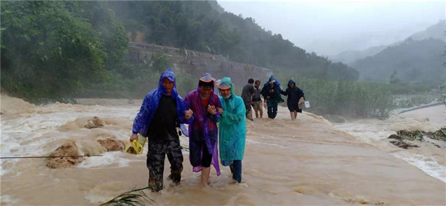 廣西河池市金城江區(qū)九圩鎮(zhèn)的干部們涉水轉移被困群眾(7月13日攝)。 新華社發(fā)(黃甫東 攝)
