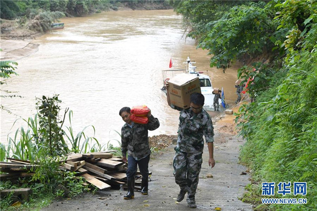 7月16日,廣西河池市東蘭縣隘洞鎮(zhèn)民兵應(yīng)急分隊隊員將救災(zāi)物資從船上扛到岸上。