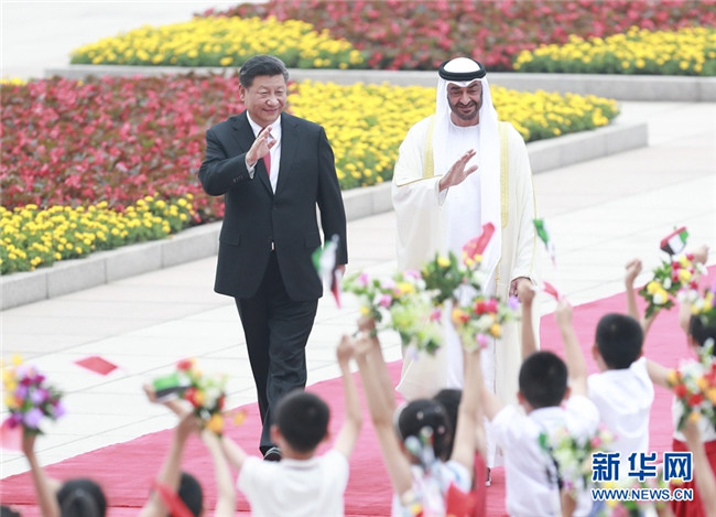 習(xí)近平主席舉行儀式,歡迎一位遠(yuǎn)道而來(lái)的貴客——阿拉伯聯(lián)合酋長(zhǎng)國(guó)阿布扎比王儲(chǔ)穆罕默德·本·扎耶德·阿勒納哈揚(yáng)。