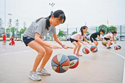 8月5日,南充小學(xué)生在操場上練習(xí)運(yùn)球?! ”緢?bào)記者 楊樹 攝