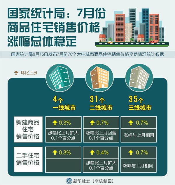 國家統(tǒng)計局城市司高級統(tǒng)計師劉建偉分析,7月份,各地繼續(xù)貫徹落實黨中央、國務院部署,始終堅持“房子是用來住的、不是用來炒的”定位,以穩(wěn)地價、穩(wěn)房價、穩(wěn)預期為目標,進一步落實房地產(chǎn)調(diào)控長效機制,房地產(chǎn)市場總體延續(xù)平穩(wěn)態(tài)勢。(記者陳煒偉)