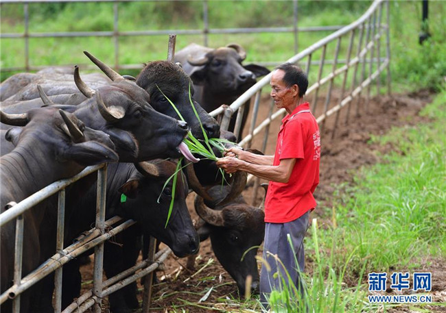 在廣西融安縣大良鎮(zhèn)古蘭村古蘭屯養(yǎng)?;?,68歲的韋肇翠在喂牛(8月18日攝)。韋肇翠是養(yǎng)?;氐娘曫B(yǎng)員,每個(gè)月有2800元的工資。 新華社記者 黃孝邦 攝