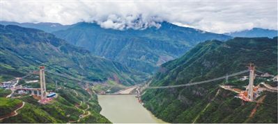 幾經(jīng)顛簸,金沙江宛若一段飄舞著的褐綢映入眼簾,橫跨兩岸的M形工程似一道飛虹,將天塹重又縫合。這道飛虹,正是跨徑達(dá)1386米、全球山區(qū)峽谷在建的最大跨徑懸索橋——云南華麗高速公路金安金沙江大橋。