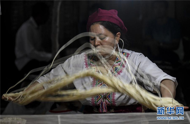在新疆喀什市歐爾達路的夜市上,一名廚師在攤位前制作拉面(8月12日攝)。新華社記者 王菲 攝