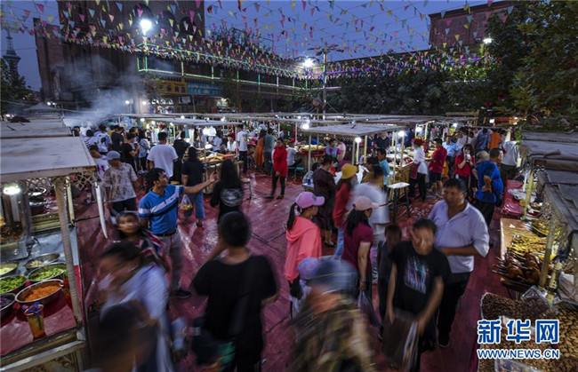 在新疆喀什市歐爾達路的夜市上,人們在觀光購物(8月18日攝)。新華社記者 王菲 攝