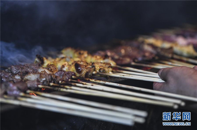 在新疆喀什市歐爾達路的夜市上,一名燒烤攤販在烤制肉串(8月12日攝)。新華社記者 王菲 攝