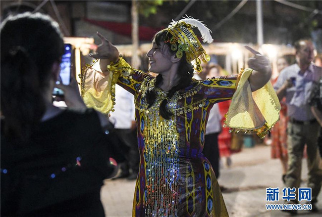 在新疆喀什市歐爾達路的夜市上,一名身穿民族服飾的姑娘邊跳舞邊錄制視頻(8月12日攝)。新華社記者 王菲 攝