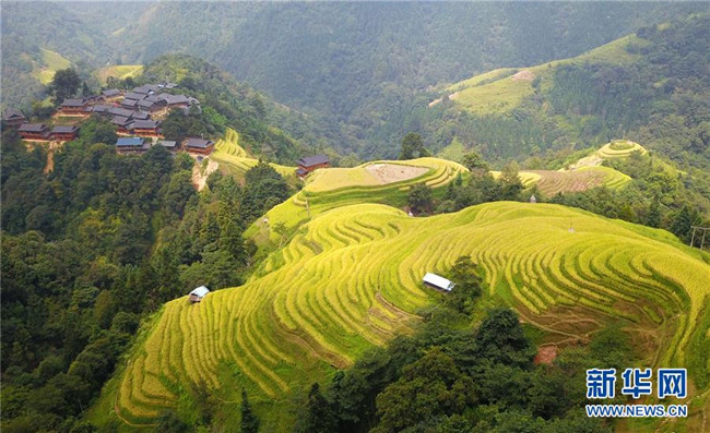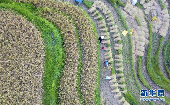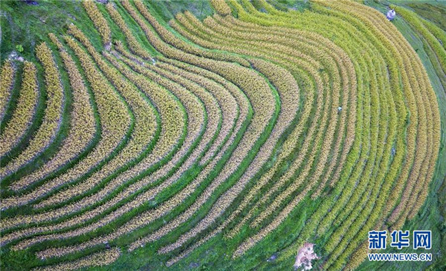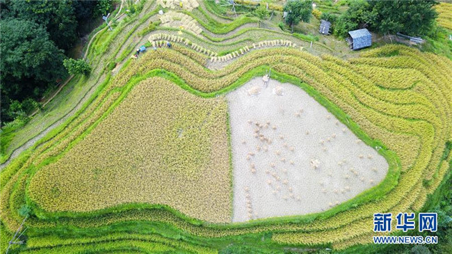 近日,貴州省黔東南苗族侗族自治州榕江縣計劃鄉(xiāng)計劃村陽開苗寨的水稻陸續(xù)成熟,農(nóng)民們搶抓農(nóng)時收割稻谷。從空中俯瞰,層層疊疊的梯田線條分明,與古樸的苗寨木樓相互映襯,美不勝收。 新華社記者 楊文斌 攝