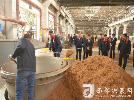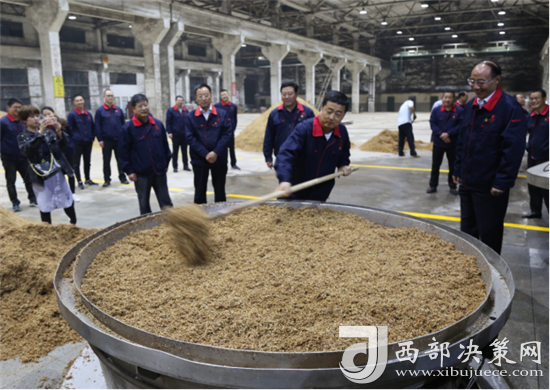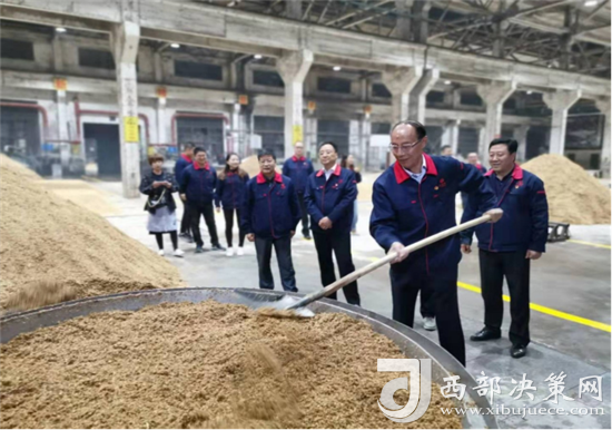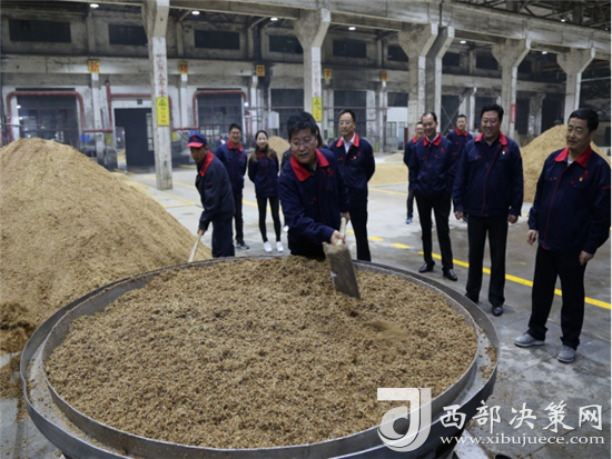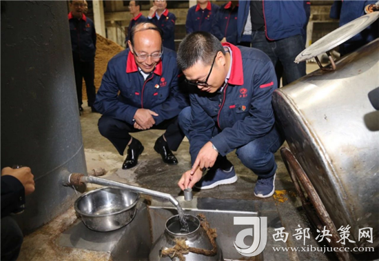 西鳳集團(tuán)公司領(lǐng)導(dǎo)班子成員還詳細(xì)查看了窖池發(fā)酵情況,現(xiàn)場(chǎng)和工人師傅們一起裝甑餾酒,為大家鼓勁加油!