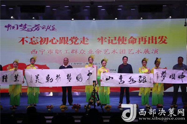 文藝展演由民樂演奏《歡天喜地迎盛世》、《牧民新歌》伴著各大書畫院書法家現(xiàn)場潑墨書法“中國夢”、“業(yè)精于勤”等作品中拉開序幕,潑墨書法、民樂演奏、花兒聯(lián)唱、歌伴舞、小合唱、詩朗誦、二重唱、秦腔樣板戲等富有時代特色、職工群眾喜聞樂見接地氣的節(jié)目輪番登臺?!对谙M奶镆吧稀芳で榍啻旱奈璧浮⒑铣栋研腋:涂鞓匪徒o你》優(yōu)美動聽的原創(chuàng)歌曲、秦腔樣板戲《紅燈記》選段等節(jié)目抒發(fā)了西寧市廣大職工群眾“砥礪奮進(jìn)新時代 譜寫西寧新篇章”的豪情。展演現(xiàn)場為觀眾分發(fā)了關(guān)于“不忘初心 牢記使命”主題教育和《西寧市文明促進(jìn)條例》的宣傳資料,通過互動知識競答方式普及相關(guān)知識,觀眾踴躍搶答,氣氛熱烈。精彩的表演贏得了在場職工群眾朋友們的陣陣掌聲,網(wǎng)絡(luò)直播點擊評論互動熱烈,展演在全體演職人員和觀眾齊聲共唱《我和我的祖國》中推向了最高潮。