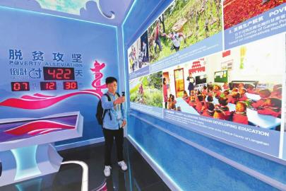 脫貧攻堅是幸福中國的生動詮釋。一塊脫貧攻堅倒計時422天的標識牌引發(fā)圍觀,展示的脫貧攻堅8項主要成果中,四川占有兩席。作為教育脫貧的成果,一張照片展現(xiàn)了涼山州昭覺縣幼教點輔導員帶領(lǐng)幼兒學習普通話的場景;嚴把貧困退出關(guān),另一張照片則展示了第三方評估團隊在甘孜州康定市開展貧困縣退出抽查的場景。