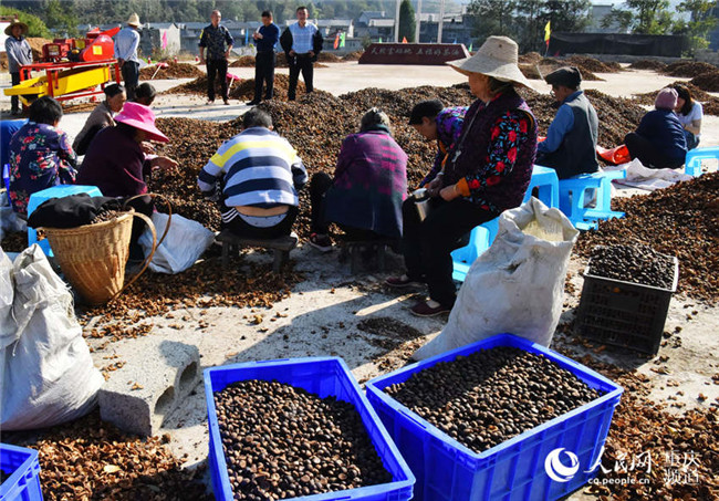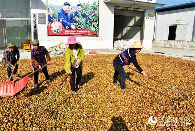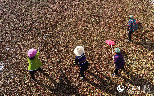 近日,重慶酉陽萬畝油茶喜獲豐收,工人們正忙著晾曬油茶籽。陳碧生攝近日,重慶酉陽萬畝油茶喜獲豐收,工人們正忙著晾曬油茶籽。陳碧生攝