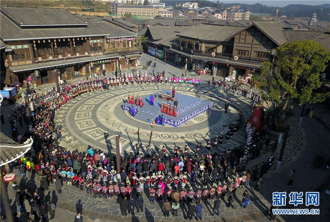 當(dāng)日,貴州省黔東南苗族侗族自治州丹寨縣迎來(lái)苗族傳統(tǒng)節(jié)日“祭尤節(jié)”,近千名身著節(jié)日盛裝的苗族群眾與游客齊聚丹寨萬(wàn)達(dá)小鎮(zhèn),歡度傳統(tǒng)佳節(jié)。