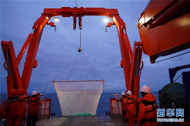 “雪龍2”號12月7日離開南大洋普里茲灣海域向西航行,開始對宇航員海海域展開科考作業(yè)??瓶缄爢T沿著本次宇航員??瓶嫉氖讉€調(diào)查斷面,自北向南做了多個站位的CTD(海水溫鹽深測量儀)采水作業(yè)、浮游生物垂直拖網(wǎng)作業(yè),以及魚類拖網(wǎng)和箱式采樣器等采樣作業(yè)。