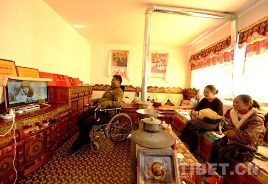圖為安置點村民在家看電視 攝影:盧忠東 (圖片來自中國西藏網(wǎng))