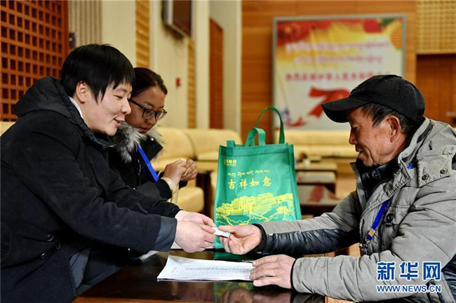 12月23日,在拉薩火車站,一名受助務(wù)工人員(右)從中國(guó)郵政集團(tuán)公司西藏自治區(qū)分公司工作人員手中接過火車票。新華社記者 張汝鋒 攝
