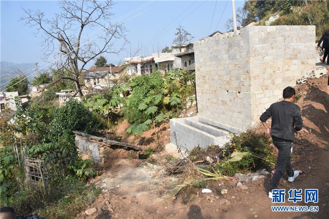 11月21日,貴州省畢節(jié)市威寧彝族回族苗族自治縣新發(fā)鄉(xiāng)松發(fā)村,老式低矮的廁所旁邊是扶貧工作隊新建的小公共廁所。新華社記者 段羨菊 攝