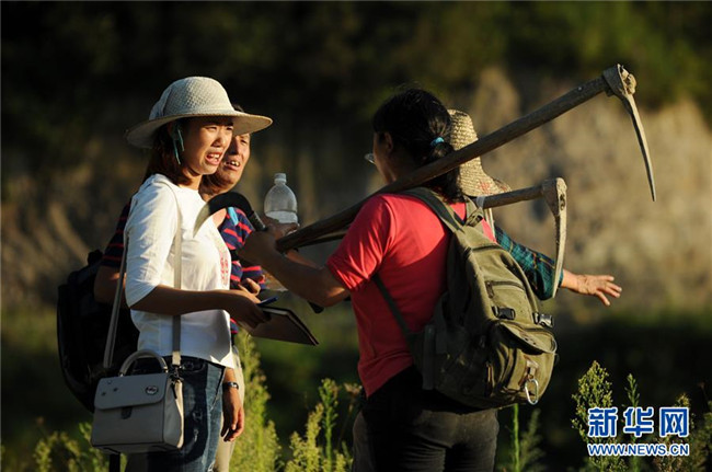 貴州省石阡縣坪山鄉(xiāng)大坪村監(jiān)委會主任左艷(左一)與下地勞作歸來的村民交談(2018年8月29日攝)。新華社記者 楊文斌 攝