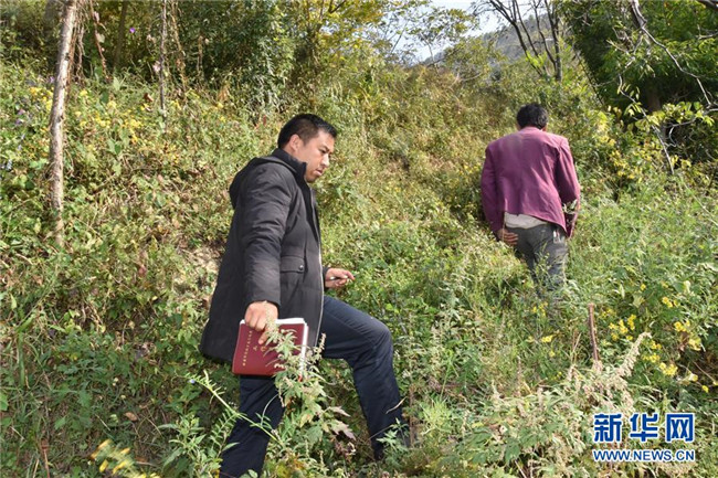 11月21日,貴州省畢節(jié)市威寧彝族回族苗族自治縣新發(fā)鄉(xiāng)松發(fā)村,下派駐村干部李大奎(左)走在查看脫貧產(chǎn)業(yè)途中。新華社記者 段羨菊 攝