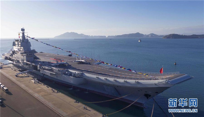 2019年12月17日,我國第一艘國產航空母艦山東艦在海南三亞某軍港交付海軍。經中央軍委批準,我國第一艘國產航母命名為“中國人民解放軍海軍山東艦”,舷號為“17”。這是2019年12月15日拍攝的??吭诤D先齺喣耻姼鄣纳綎|艦(無人機照片)。 新華社記者 李剛 攝