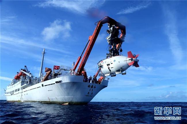 在西太平洋海域,“蛟龍”號載人潛水器離開“向陽紅09”科學考察船準備進入水中,進行中國大洋38航次最后一潛(2017年6月13日攝)。 新華社記者 劉詩平 攝