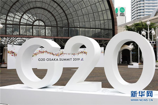這是2019年6月27日在日本大阪拍攝的G20大阪峰會(huì)新聞中心入口處的標(biāo)志。 新華社記者 杜瀟逸 攝