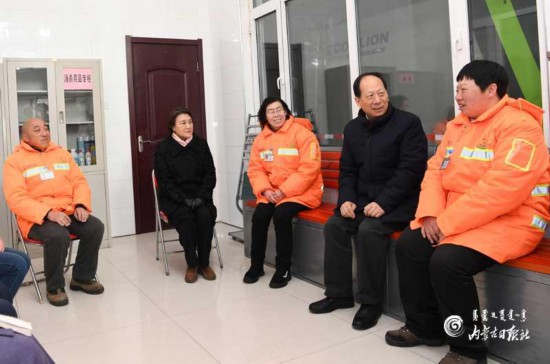 每逢節(jié)慶假日,往往是環(huán)衛(wèi)工人最忙最累的時(shí)候。石泰峰、布小林惦記著這些非常辛苦的勞動(dòng)者,來到賽罕區(qū)環(huán)衛(wèi)局管理八所,向他們祝賀新年。在環(huán)衛(wèi)工人休息室,石泰峰、布小林與大家圍坐在一起親切交談,了解春節(jié)期間值班安排情況,仔細(xì)察看休息室及相關(guān)保障情況。石泰峰深情地說,環(huán)衛(wèi)工人是城市的“美容師”,你們一人勞累,換來萬人清潔,沒有你們的辛勤工作,就沒有城市環(huán)境的清潔美麗,也就沒有市民生活的安逸舒適,謝謝你們,給你們拜年了。