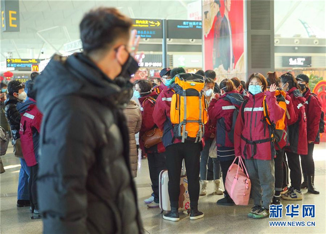1月25日,送站親友在鐵路南京南站為首批江蘇援湖北醫(yī)療隊(duì)隊(duì)員打氣加油。當(dāng)日,首批江蘇援湖北醫(yī)療隊(duì)從南京集結(jié)出發(fā),奔赴武漢。 新華社記者 李博 攝
