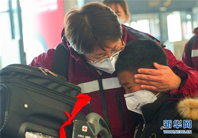1月26日,遼寧省醫(yī)療隊(duì)隊(duì)員、大連市友誼醫(yī)院呼吸內(nèi)科醫(yī)生王利菊(左)在出發(fā)前與兒子告別。當(dāng)日,遼寧省醫(yī)療隊(duì)出征,137名醫(yī)護(hù)人員從沈陽桃仙國際機(jī)場(chǎng)出發(fā),馳援湖北。新華社記者 龍雷 攝