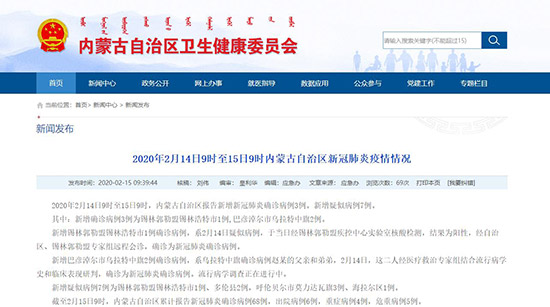 2月15日,記者從內(nèi)蒙古自治區(qū)衛(wèi)生健康委員會獲悉,2020年2月14日9時至15日9時,內(nèi)蒙古自治區(qū)報告新增新冠肺炎確診病例3例。新增疑似病例7例。