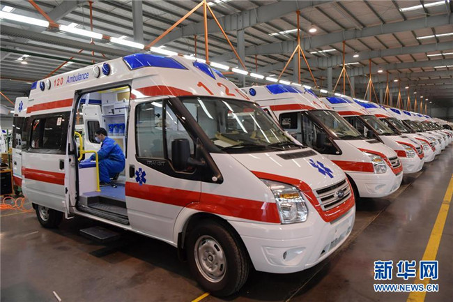 在江西江鈴汽車集團改裝車股份有限公司負壓救護車生產基地內,工作人員在負壓救護車生產線上進行裝配調試(2月6日攝)。 新華社記者 彭昭之 攝
