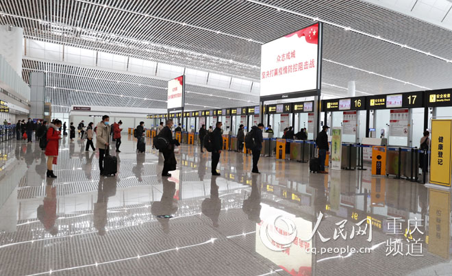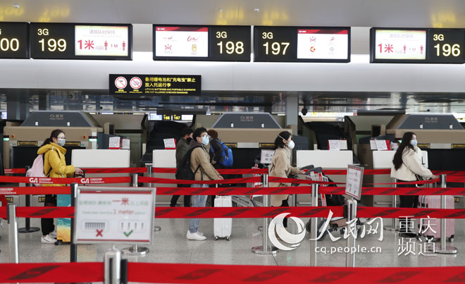 隨著旅客返程復(fù)工增多,重慶機(jī)場為最大限度減少人員聚集,通過自助值機(jī)、無紙化值機(jī)縮短旅客在候機(jī)樓停留時間同時,引導(dǎo)旅客在值機(jī)、安檢、登機(jī)排隊時,都保持1米以上的安全防護(hù)距離。